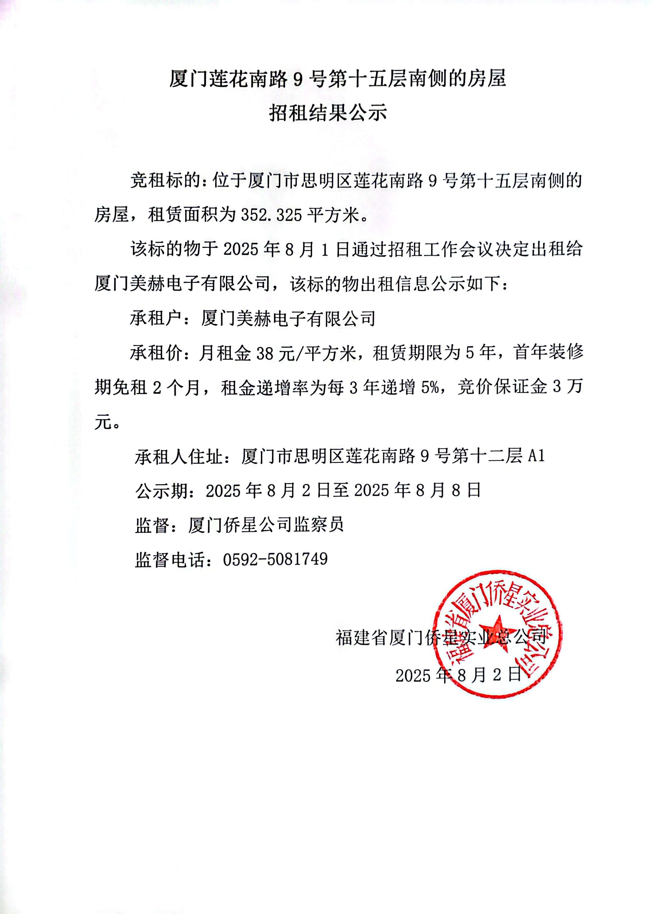 廈門(mén)蓮花南路9號(hào)第十五層南側(cè)的房屋招租結(jié)果公示