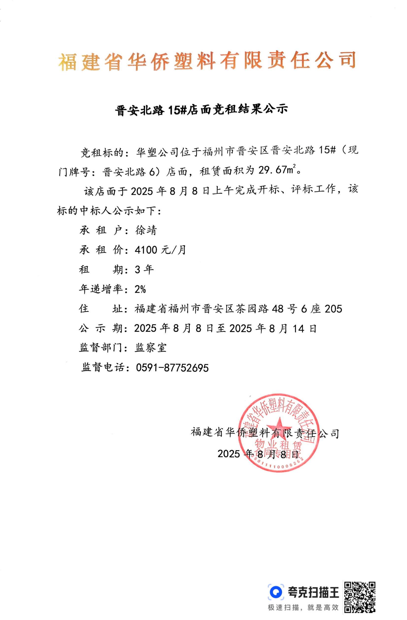 晉安北路15#店面競租結果公示
